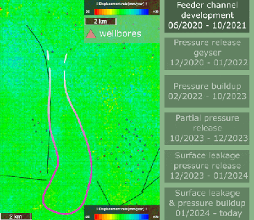 4. The well where the geyser occurred was shut in within weeks, after which the surface uplift resumed – uninterrupted for a year, until a second water-to-surface event happened;